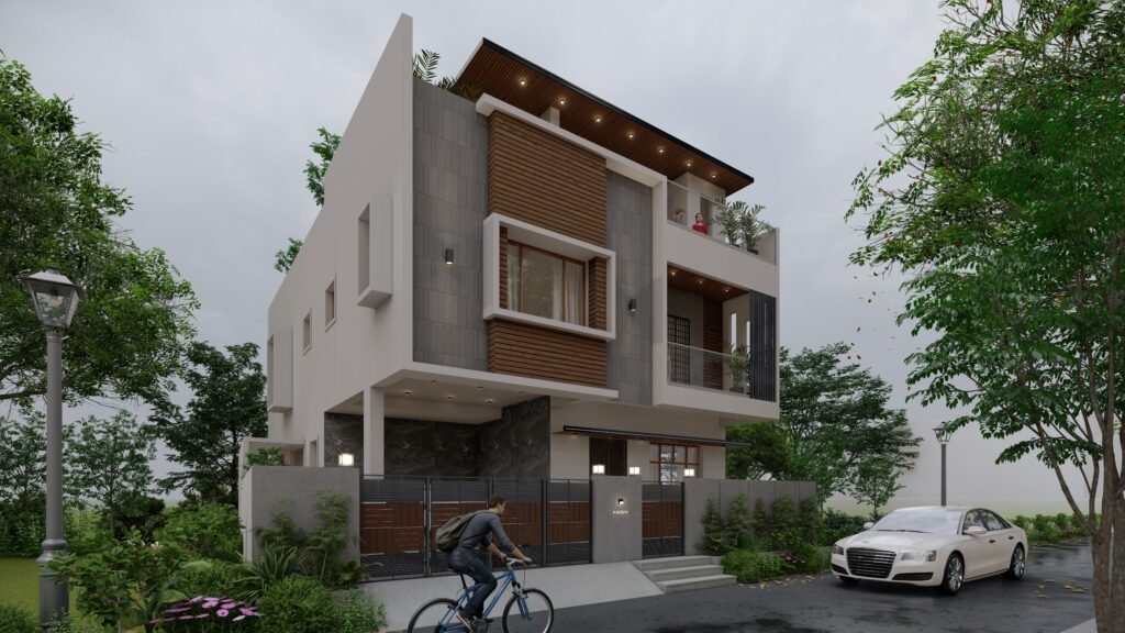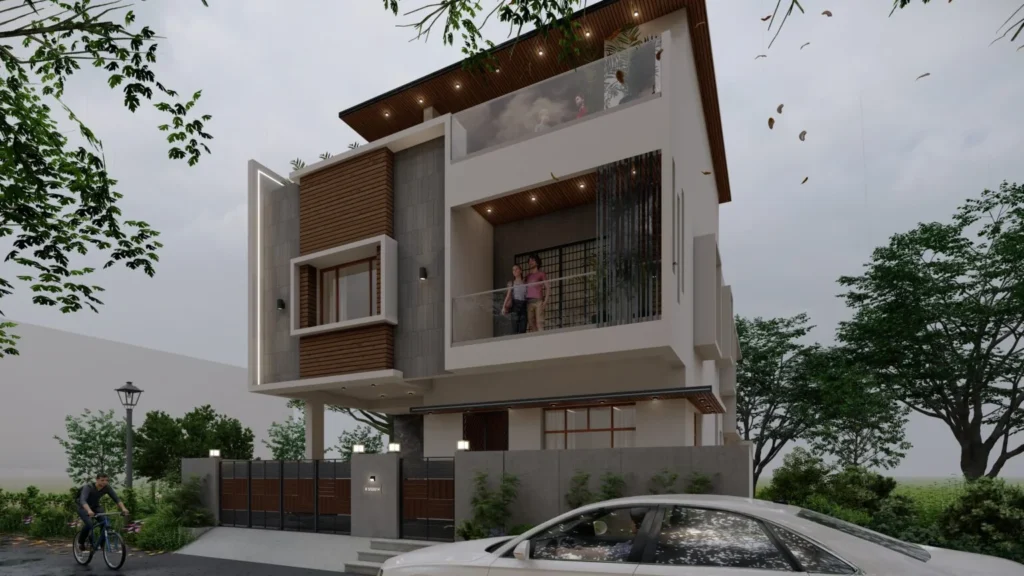 Step into this modern compact jewel: a lyrical blend of minimalist architecture and intelligent design. Where impactful design meets family-centric layouts. The clean-lined facade—layered in concrete panels and wood clads—leads you through a covered porch to a sunlit entry foyer. Step inside to spacious, interconnected living, dining, and kitchen zones, accentuated by a feature mirror wall and sleek glass sliding doors opening to a cozy sit-out. The gourmet modular kitchen, with its central island and handleless cabinetry, flows intuitively into the dining area. Bedrooms are thoughtfully zoned: a serene king-size master suite with lounge nook, two bright and playful bedrooms, and a flexible study-guest room with built-ins. Bathrooms echo spa-like luxury with rain showers, glass partitions, and smart lighting.